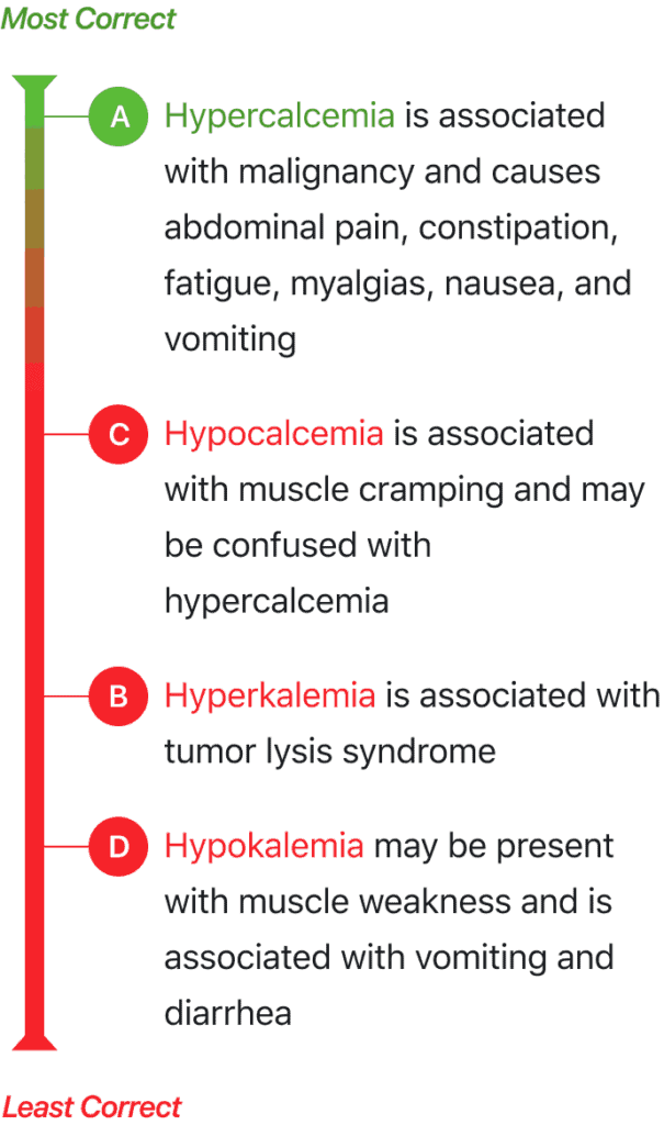 QUESTION: A 67-year-old woman who was recently diagnosed with breast cancer presents with increasing confusion over the past three days. Additionally, over the past week she has been complaining of fatigue, diffuse body aches, poorly localized abdominal pain, and constipation. Which of the following electrolyte abnormalities is the most likely explanation for her symptoms?