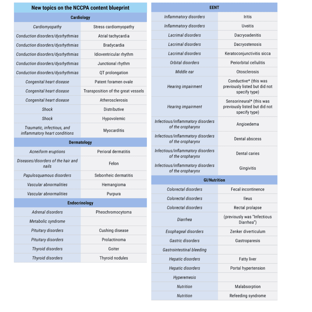 The content adjustments in the new PANCE blueprint are more granular. You may notice minor changes (e.g., stress cardiomyopathy being added to the cardiovascular topic list), changes in topic names (e.g., essential hypertension to primary hypertension), correction of errors (e.g., removal of eczema since atopic dermatitis was already listed), or some topic lists expanding quite significantly (the EENT topic list is now 2 pages). In some of these instances, topics that may have already been a staple in your didactic lectures (or hey, here on Rosh/Blueprint!) are now formally added (e.g., uveitis).