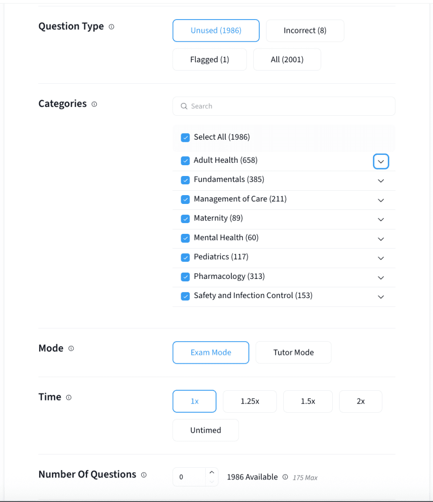 When setting up your practice set, you have numerous options! You have the option to select the question type, category, mode, time, and number of questions!