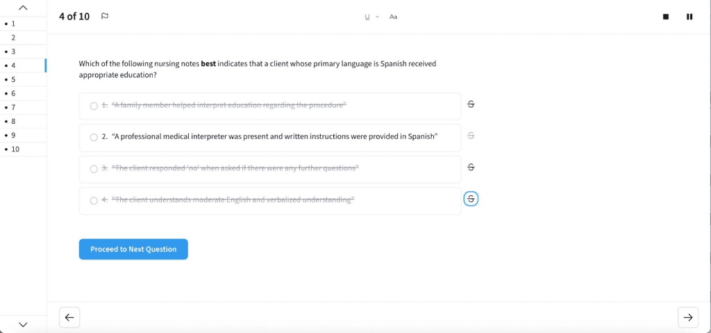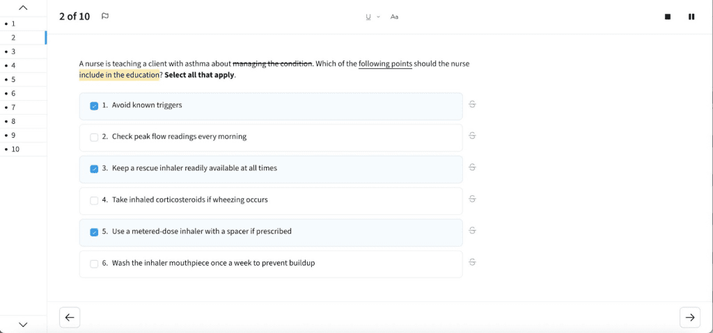 The Qbank also lets you highlight, underline, and strike out words, which can help you pinpoint the most crucial info. If you’re unsure about certain questions, you have the option to “flag” them in the upper left hand corner and revisit them later.